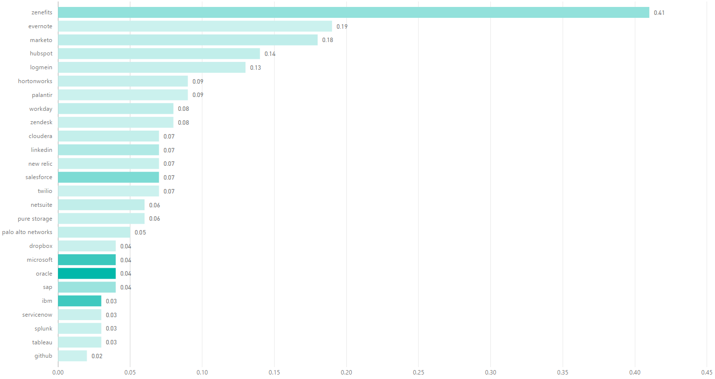 This chart reveals several key technology companies ranked in reverse order of sales churn – so higher on the chart (or longer the bar) the higher the churn (so from worst at the top to best at the bottom).