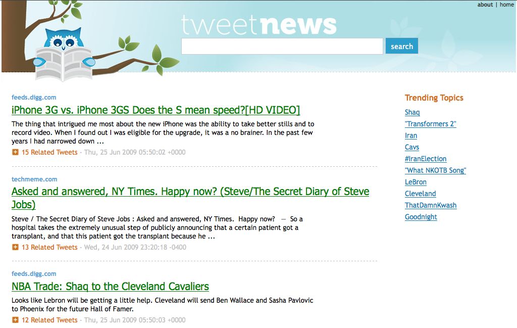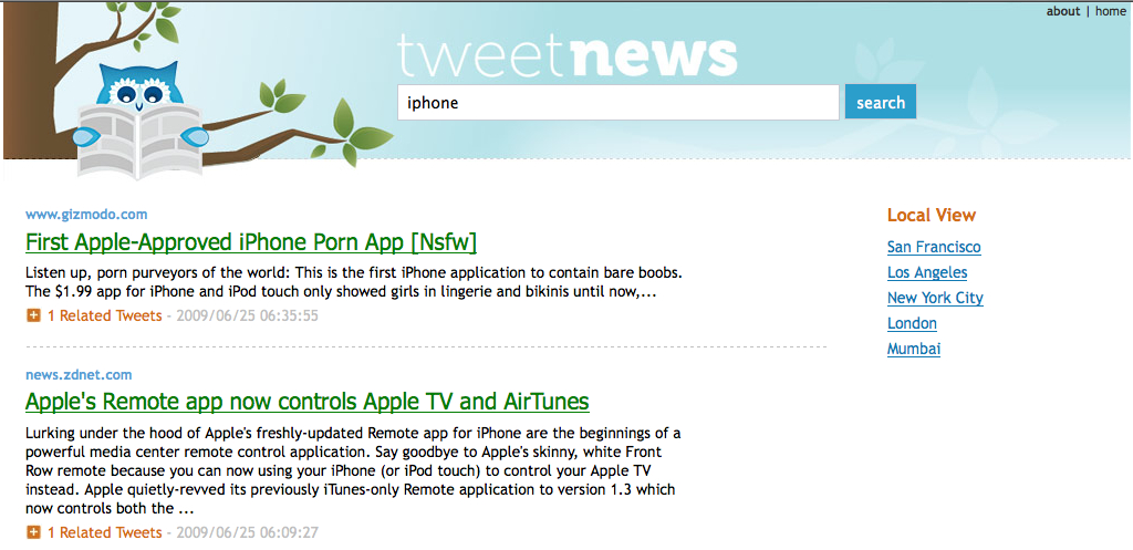 About six months ago I released a simple 100 line search application called TweetNews, which basically links tweets to the freshest Yahoo! News articles. The more related tweets an article has, the higher its rank. The tweet count and messages are presented underneath each result so that a user can read the social commentary inline with the article listing. It was developed more to demonstrate the openness and power of Yahoo! BOSS (you can read more about it in my previous posts here and here). Remarkably, many users found the service useful despite its slow performance, barebones UI, lack of homepage, domain, (you name it), etc.